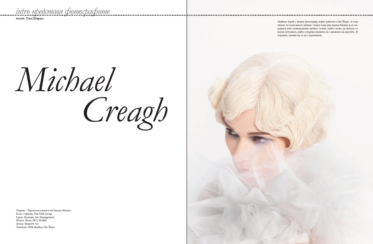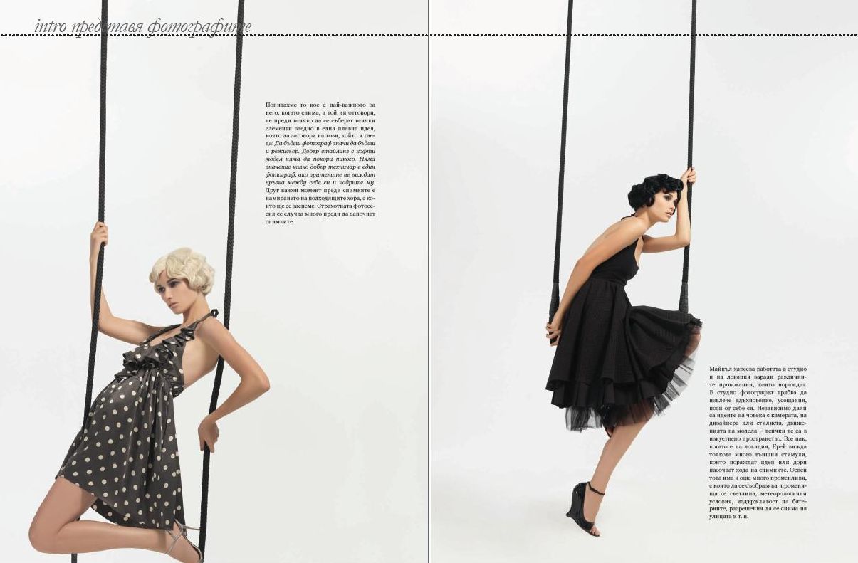 I got the PDF’s yesterday from a story about my work in Intro Magazine from Bulgaria. They featured the Trapeze shoot I did with Susana Monaco. Unfortunately, not speaking Bulgarian (or any Slavic language), I have no idea what they said. Hint: If you speak Bulgarian let me know! I have one friend I am going to ask and maybe I will post a translation at some point. I think it will be hard to read the text here anyhow as the photo size I posted is not very big (but you can click to enlarge them just enough).
