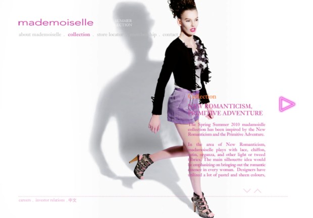 Here is the campaign for the Spring Summer 2010 Mademoiselle HK Campaign. I have also included several of the screen shots screen shots from their website. I have not gotten my hands on the actual catalog yet. If anyone is near the 20 stores in Hong Kong, China and Taiwan, please take some snapshots of the big store displays and email them to me. I have not seen any of them yet. Let season’s photos looked great blown up floor to ceiling.