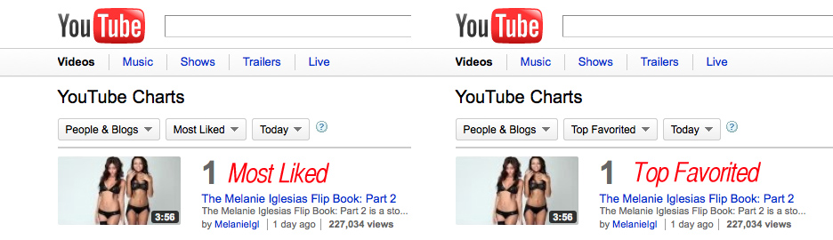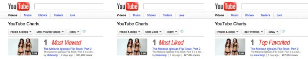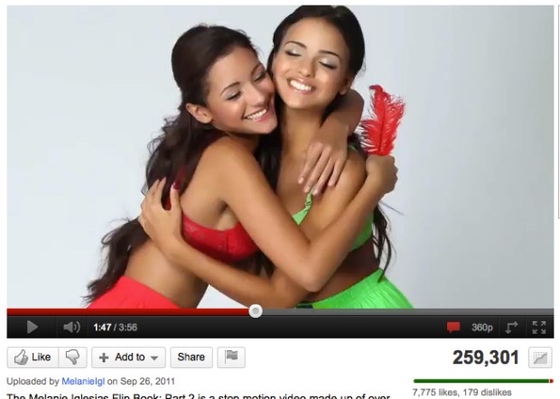 If you haven’t yet, please check out The Melanie Iglesias Flip Book Part 2 video. Out for just 48 hours now, it has a whopping 400,000 hits, 8800 Likes and has 11 YouTube honors; including the #1 Viewed, #1 Rated and #1 Favorited Video of the Day for People & Blogs, the #4 Most Discussed in P&B, and the #6 Favorited and #11 Viewed Video today of every YouTube Video in the world.