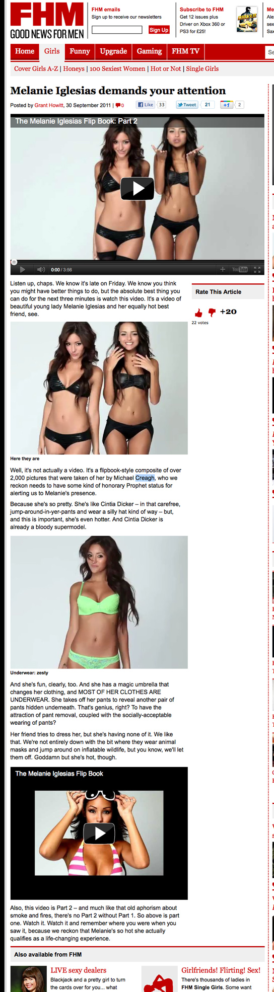 Very Cool for FHM Magazine to do a story on the Melanie Iglesias Flip Books 1 and 2 today. They featured the first video when it came out, but this was a little more special as they attached a fun story about both. The videos are doing amazing. Part 1 is over 1.1 Million views today and Part 2 is at 740,000 views in 4 days. Amazing. Below are links to both, plus the link to ALL Melanie links.