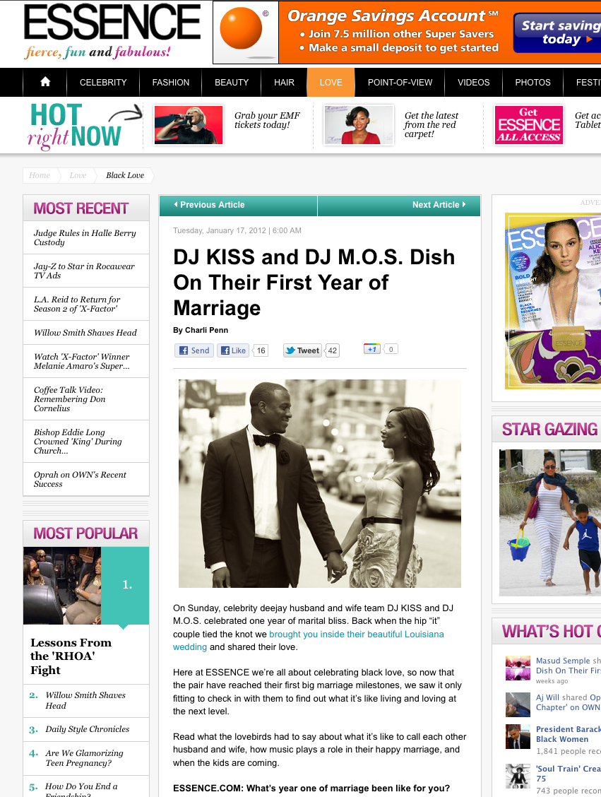 I wanted to share a photo that is currently on Essence Magazine’s website. DJ Kiss + DJ M.O.S. are like family to me. This was a quick shot I did for their engagement. If you follow the link on Essence’s site, you can see some photos I did of their wedding last year.