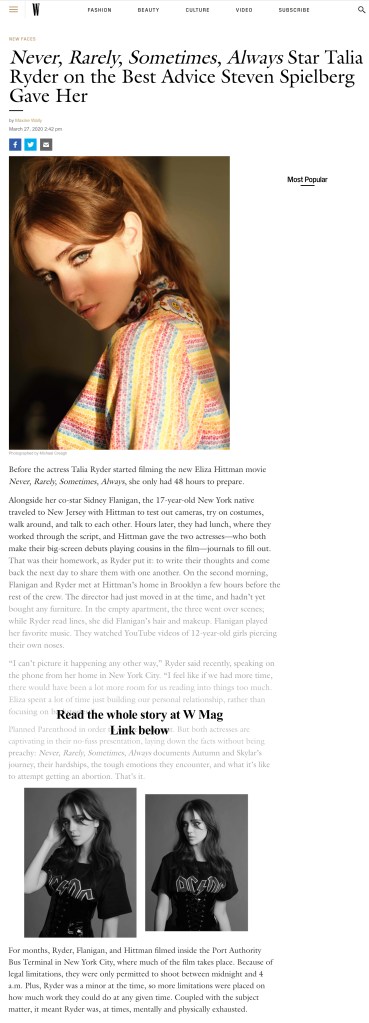 Check out W Mag.com for a great interview of Talia Ryder who co-stars in Never Rarely Sometimes Always which will be available for streaming April 3rd, and premiered at Sundance winning a Special Jury Award for Neo-Realism. She is in the new Steven Spielberg adaptation, West Side Story.
